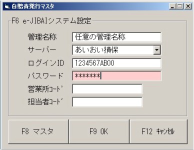 メインメニュー → マスタ → F9保険系マスタ → 自賠責発行マスタ より設定します。 |
