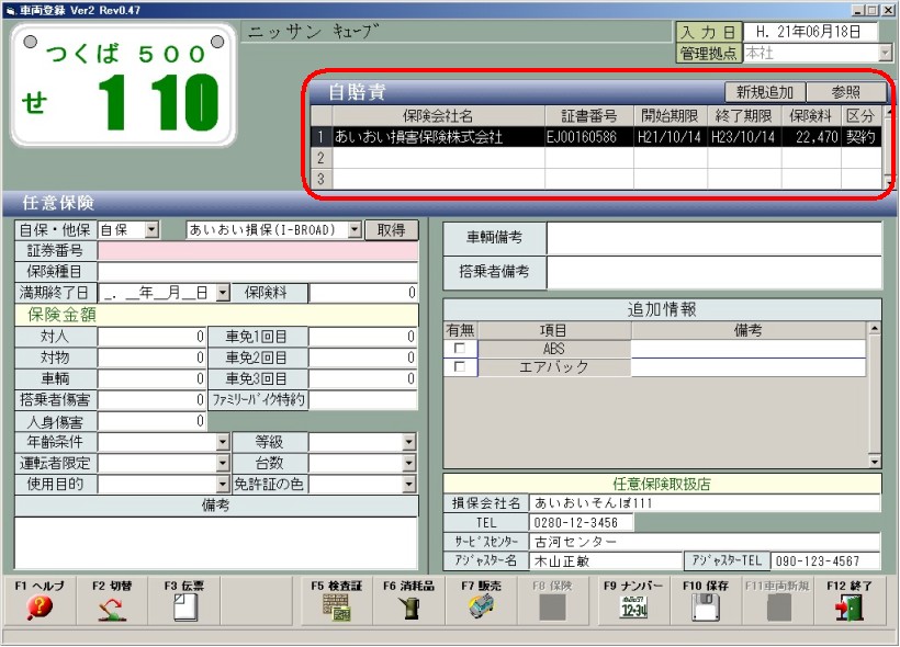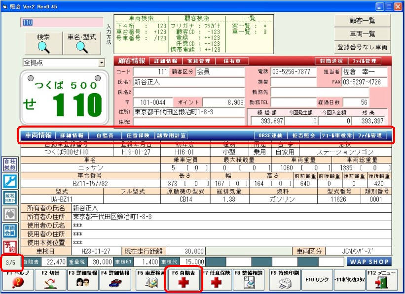 車両情報のカスタムボタン【 自賠責 】、もしくは F2切替 × 2回 → F6自賠責 を押します。 |