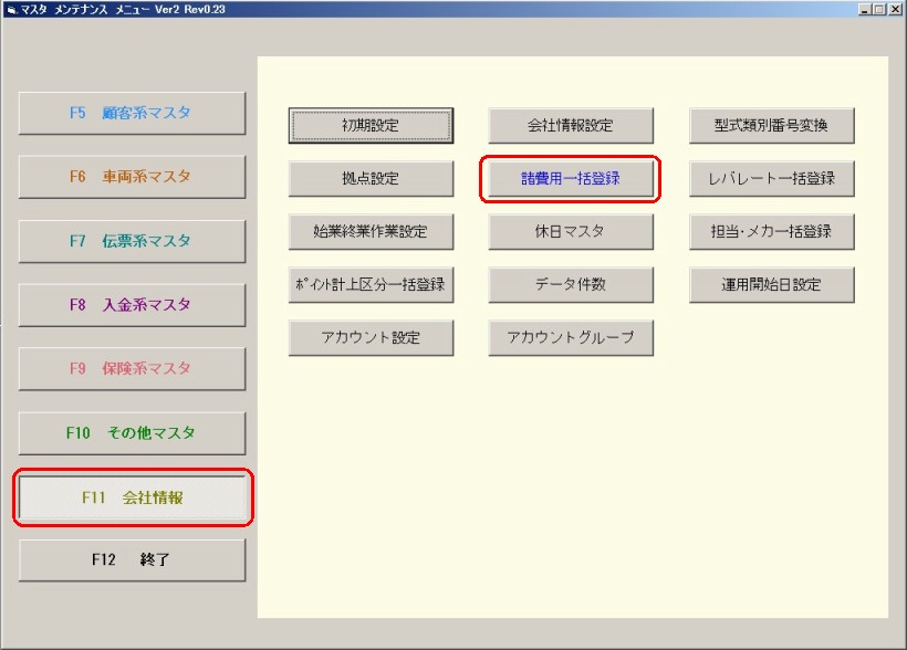 マスタメンテナンスメニュー画面:F11会社情報:【諸費用一括登録】ボタンより諸費用一括登録画面を起動します。 |