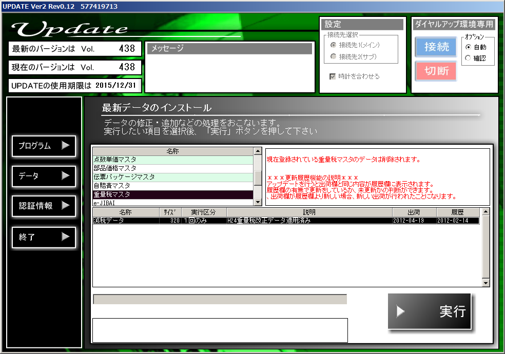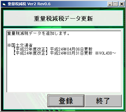 上記画面の実行ボタンを押すと重量税減税データ更新画面がでるので登録ボタンを押します