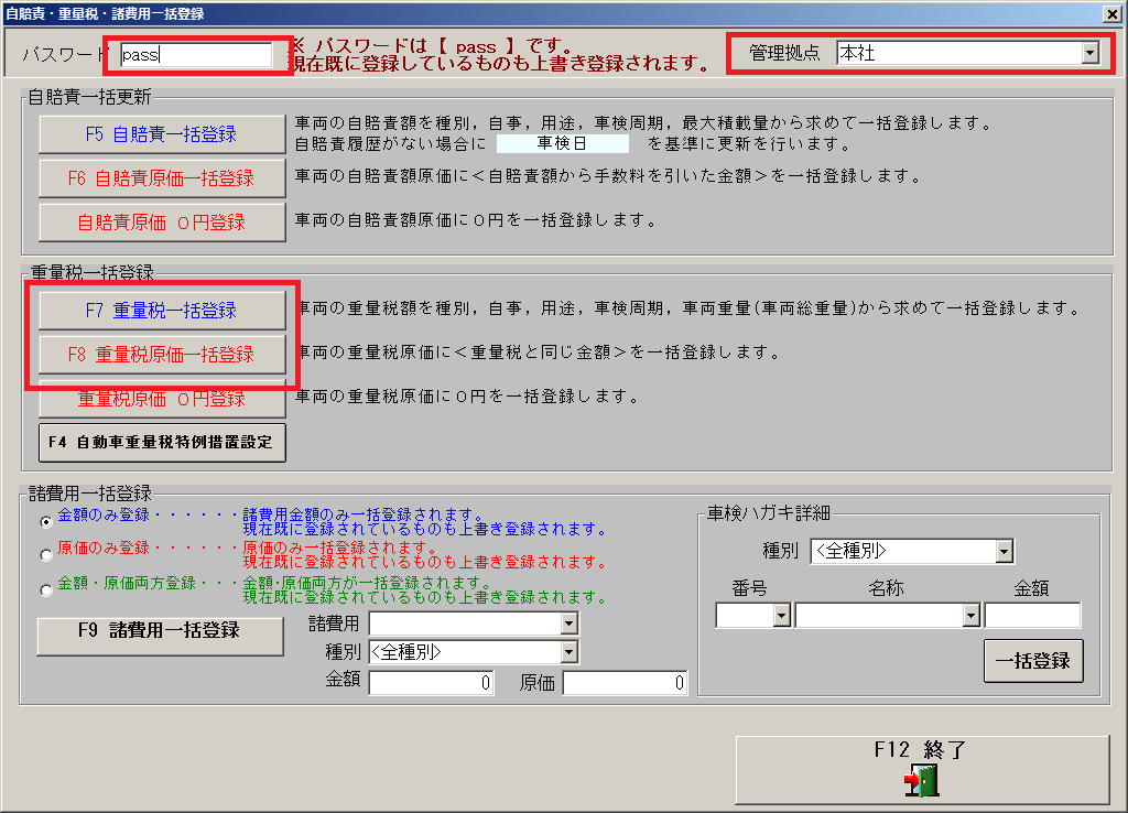 F8 重量税原価一括登録 をそれぞれ実行します。