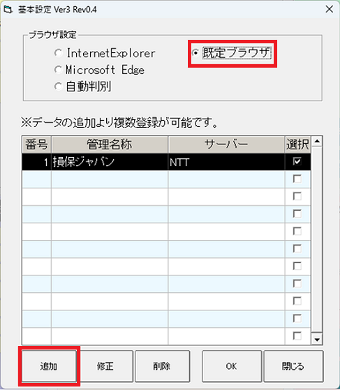 2.「既定ブラウザ」を選びます。[追加]をクリックします。