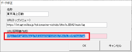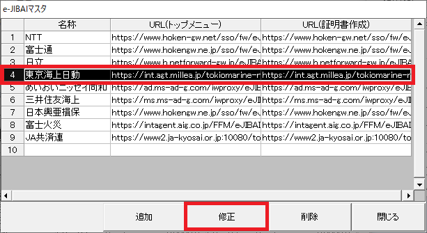 4.「東京海上日動」、または「日新火災」の行をクリックし、[修正]をクリックします。