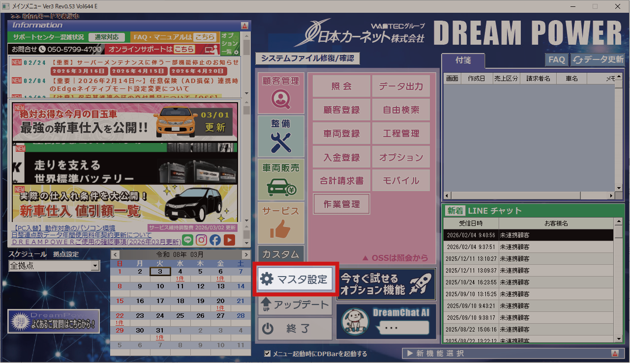 1.DREAM POWER MENU画面の「マスタ設定」をクリック
