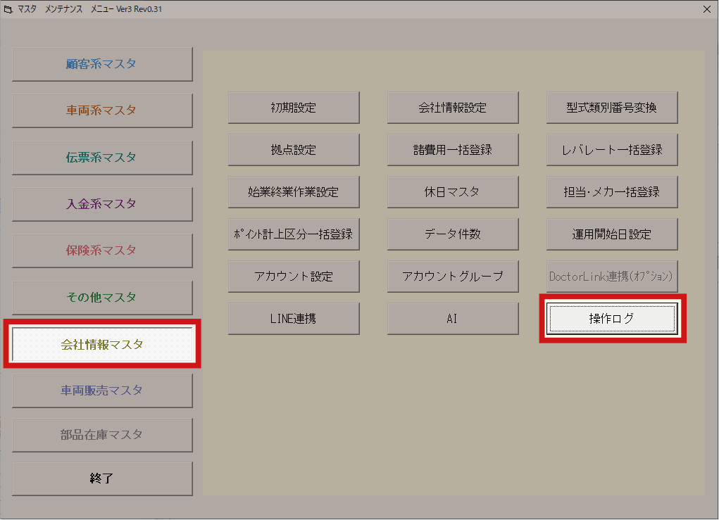 2.「会社情報マスタ」、「操作ログ」の順にクリック