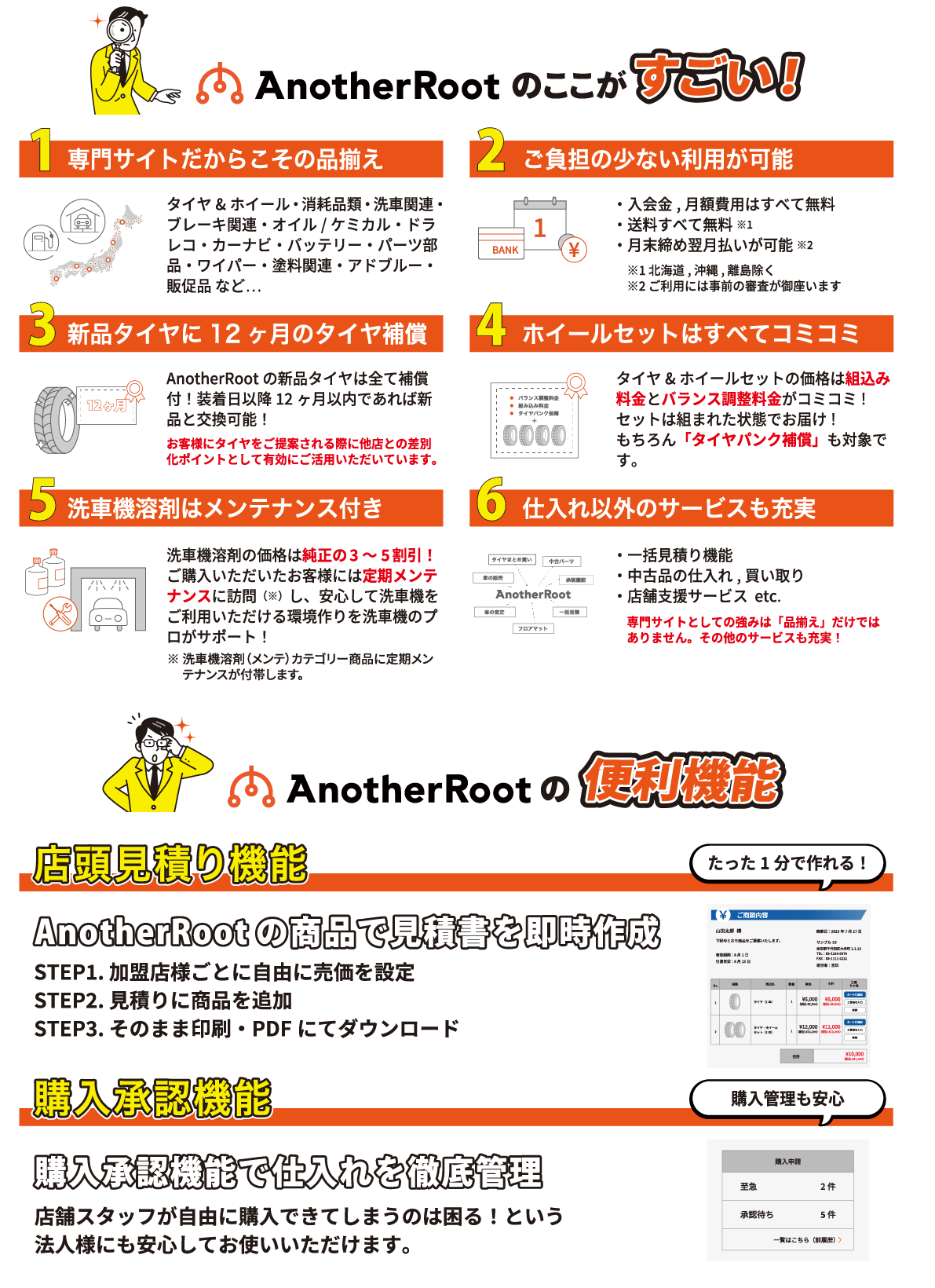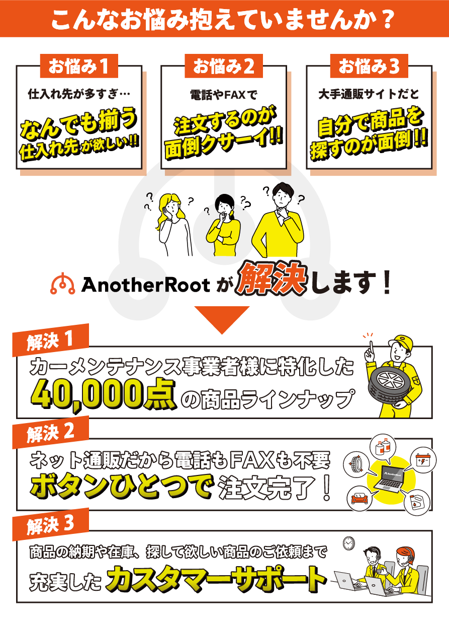 国内・海外有名ブランドタイヤ、オイル、ドラレコ、販促品まで、幅広い商品を取り揃えています。