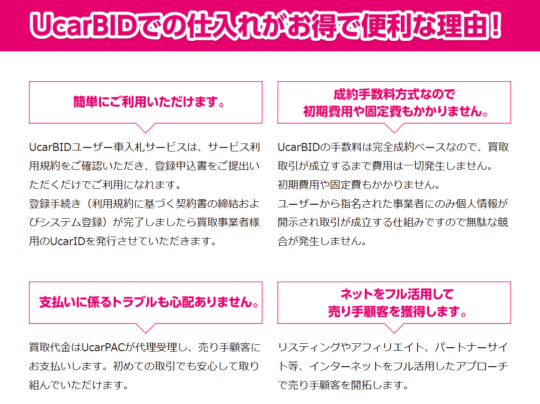 日本カーネットは、UcarPAC株式会社とユーザー車入札サービス – UcarBID(ユーカービッド)について業務提携を行いました。